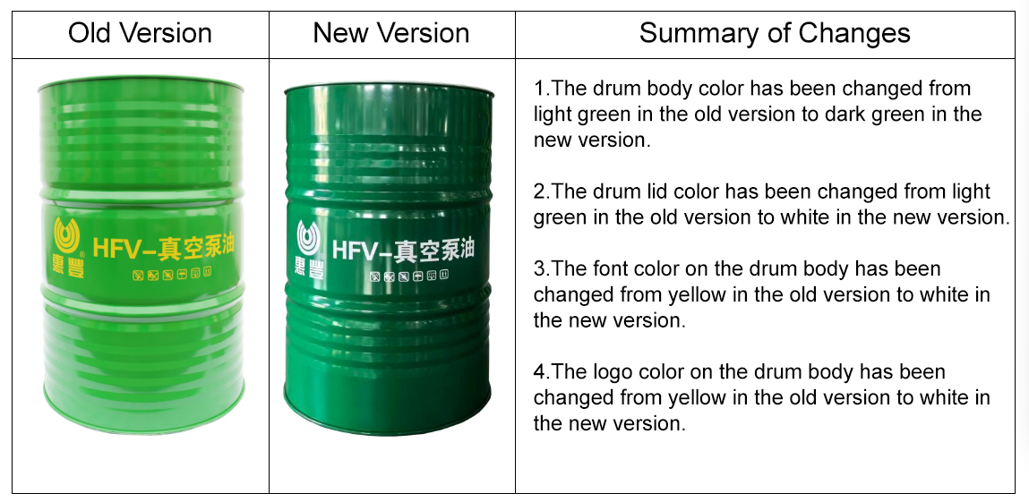 Thank you for your long-standing support and trust in Suzhou Huifeng Lubrication Materials Co., Ltd. To better convey our brand philosophy and enhance your service experience, we will be upgrading the 200L packaging for our HFV-100#, HFV-100a, and HFV-150# vacuum pump oils. This update aims to provide you with continued high-quality service through a clearer and more professional appearance.